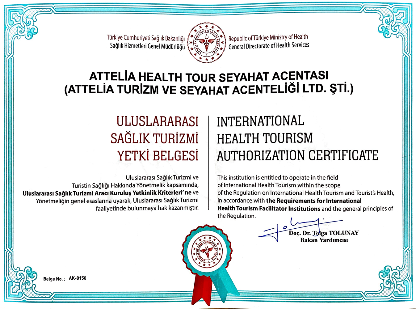 Attelia Health Tour, das durch den Verband der Reisebüros (TÜRSAB) akkreditiert und durch "Zertifikat für Reisebüromanagement" der Klasse A und die vom Gesundheitsministerium der Republik Türkei erteilte „Zulassungsbescheinigung für Gesundheitstourismus“ zugelassen ist, bietet Ihnen ein einzigartiges Erlebnis im Bereich Gesundheitstourismus in Antalya, indem es Ihnen mit all diesen Fähigkeiten und unserer im Laufe der Jahre gesammelten Erfahrung sichere, vorteilhafte und rechtliche Zusicherungen gibt. Die Behandlungen werden in vertraglich vereinbarten Gesundheitseinrichtungen durchgeführt, die über eine Berechtigung zum Gesundheitstourismus verfügen.